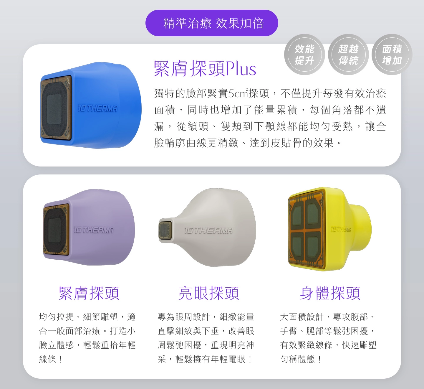 | 灰色探頭-亮眼探頭 | 0.25cm² | 專為眼周脆弱肌膚設計,適用於上下眼皮的緊緻拉提, 能有效撫平魚尾紋、改善眼周細紋,並對輕微的眼皮下垂提供支撐。 |