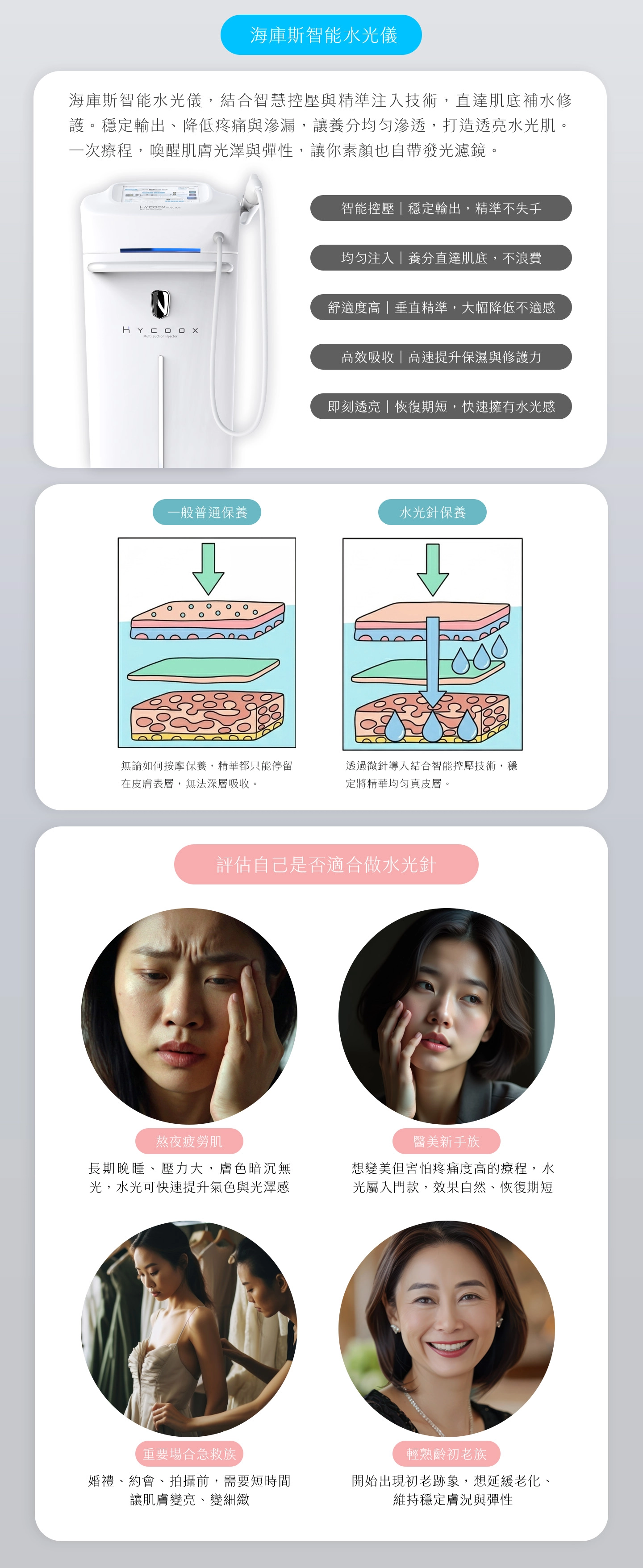 本內容僅供參考,實際醫療效果因個人體質而異。任何醫療行為均有其風險,施作前請務必經由專業醫師諮詢評估。本診所採用之HYCOOX 海庫斯智能水光儀系統為衛福部核准之原廠正貨 (衛福部衛部字號第035969號) 。